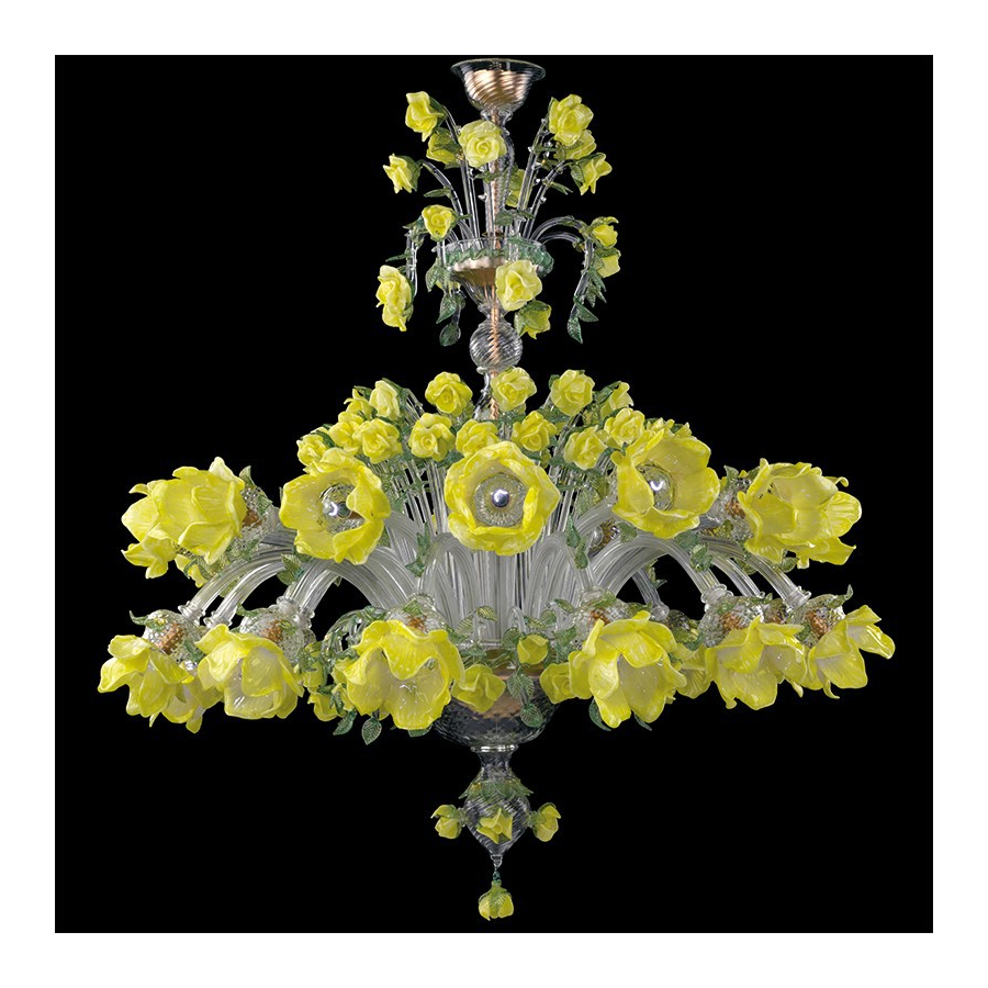 Yellow Roses Murano Glass Chandelier ist eine Pendelleuchte aus dem berühmten Muranoglas. Die gelben Rosen sind mundgeblasene Glasdekorationen, die von Kunsthandwerkern aus Murano handgefertigt werden.