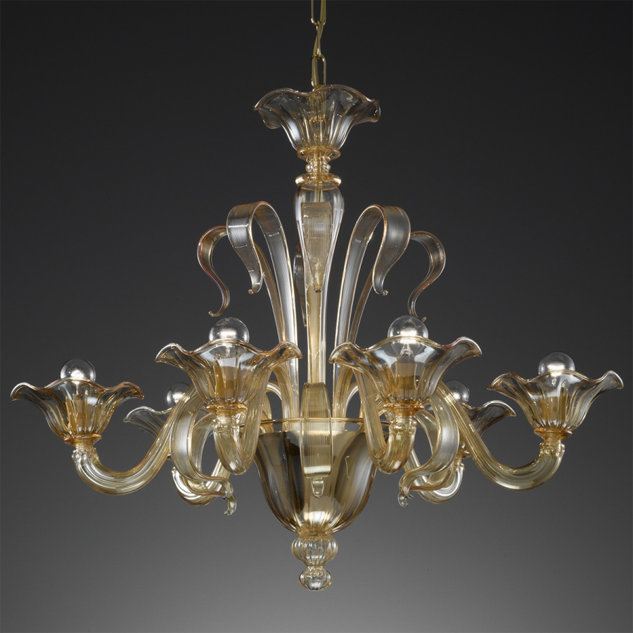 Einfacher und eleganter Kronleuchter aus Muranoglas. Transparentes Glas oder Bernstein, andere Farben auf Anfrage.