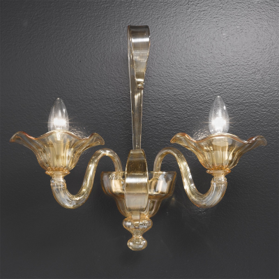 Schöner Kronleuchter aus goldenem Muranoglas. Es hat eine runde Form am Rand der Lampenfassungen.