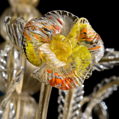 Dieser venezianischen Glas-Kronleuchter verfügt über eine hochmoderne freie Anordnung der Formen. Es ist mit tiefen und lebendigen Blütenformen geschmückt.