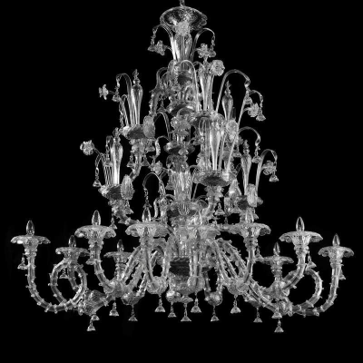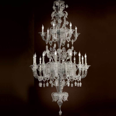 Dies ist eine der klassischen Rezzonico Kronleuchter in Klarglas. Die in mehreren Ebenen angeordnet Lichter ermöglichen, Räume mit wichtigen Höhen zu beleuchten.