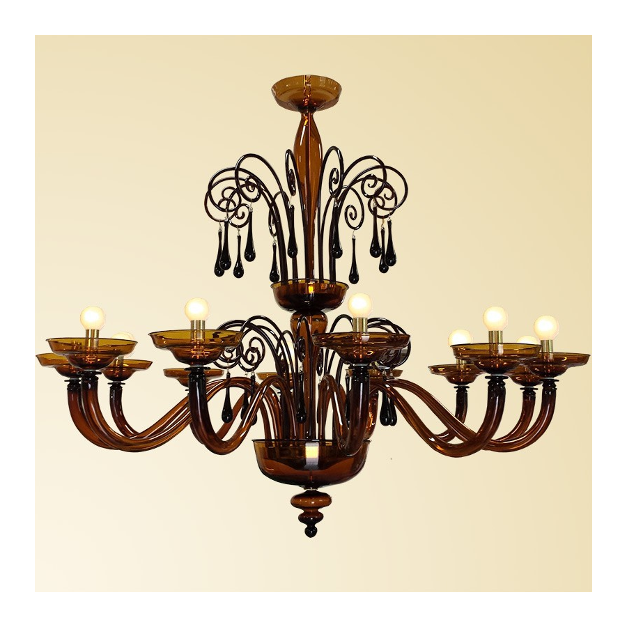 Erstaunlich modernen Kronleuchtern aus Murano-Glas. Ein schönes Werk der modernen Kunst unserer Meister Glasbläser. 12 Leuchten aus Murano-Glas dunkel bernsteinfarben.