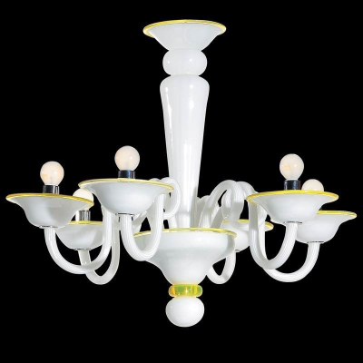 Dieser venezianischen Glas-Kronleuchter besteht aus milchig weißem Muranoglas mit Kanten und Abschlüssen aus transparentem gelbem Glas.