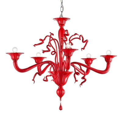 Dieser beeindruckende Murano-Kronleuchter hat sechs Lichter und ist vollständig aus leuchtend rotem Glas gefertigt. Das kühne Design des Kronleuchters zeigt aufwendig gestaltete Arme und eine zentrale Säule, die mit aufwendigen, blattähnlichen Texturen verziert ist, die Raffinesse und künstlerisches Flair ausstrahlen. Jeder der sechs Arme trägt eine schlanke, kerzenförmige Leuchte, die den dramatischen roten Farbton des Glases ergänzt. Die Kombination aus intensiver Farbe und aufwendiger Glasarbeit ergibt ein faszinierendes Stück, das sowohl als funktionale Lichtquelle als auch als atemberaubendes Mittelstück dient und die außergewöhnliche Handwerkskunst und Eleganz der Murano-Glaskunst verkörpert.