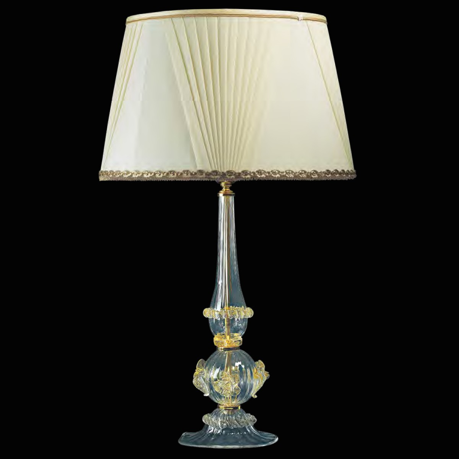 Amelie – Tischleuchte aus weißem und goldenem Muranoglas mit Goldverzierungen. Lampenschirm aus plissiertem Stoff.