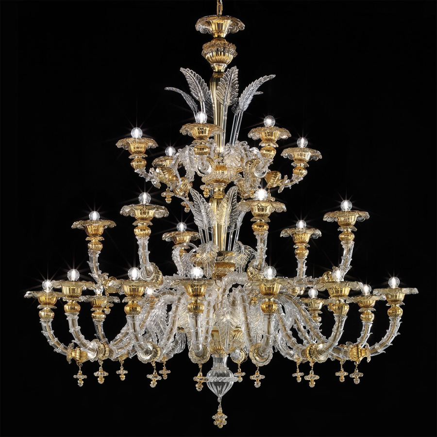 Marco Polo ist ein Kronleuchter aus Muranoglas im Rezzonico-Stil. Verfügbar in Versionen: - Transparent - Transparent mit 24 Karat Gold Dekor