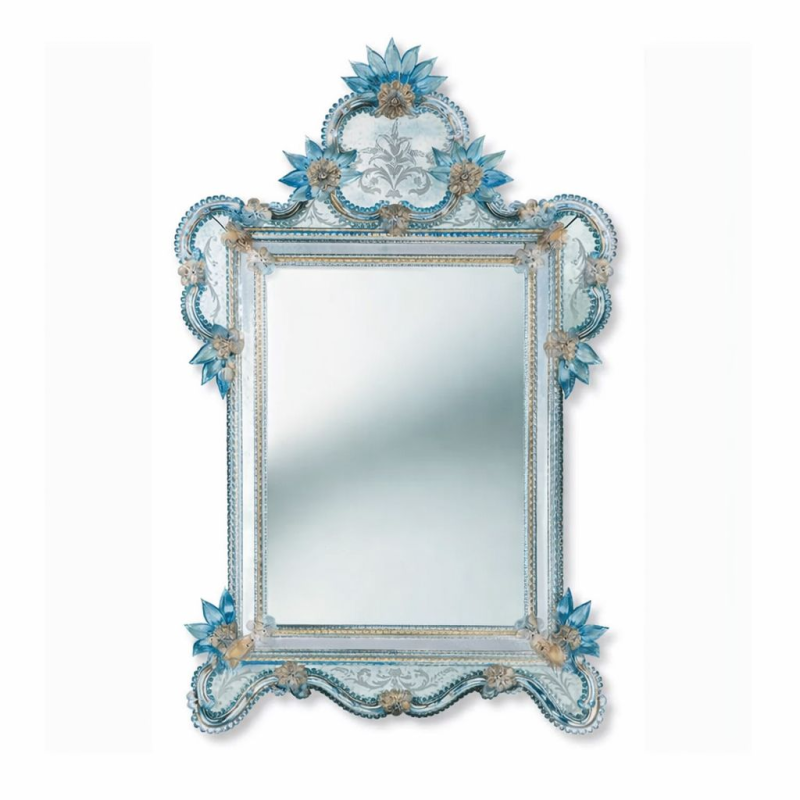 Gravierter und transparenter venezianischer Spiegel mit Pasta Blumen. Verpackung in Holzkiste.