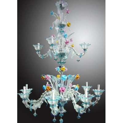 Eine klassische venezianische Kronleuchter in semi-Rezzonico-Stil. Die Angaben in Aquamarin und die bunten Blumen die Verbesserung ihrer Schönheit.