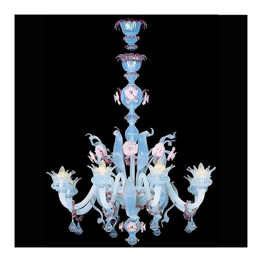 Eine klassische venezianische Kronleuchter in semi-Rezzonico-Stil. Die Angaben in Aquamarin und die bunten Blumen die Verbesserung ihrer Schönheit.
