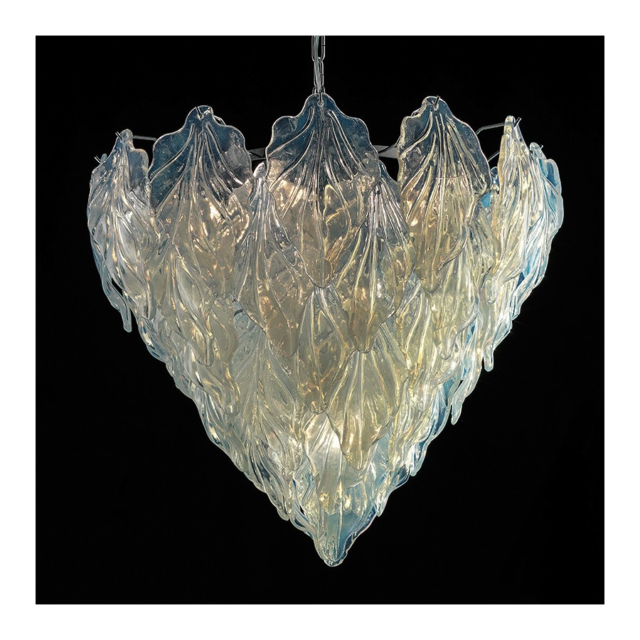 Murano glas Kronleuchter mit transparenten und leichten Blättern. Opalglas mit Chrom oder Gold 24K Struktur.