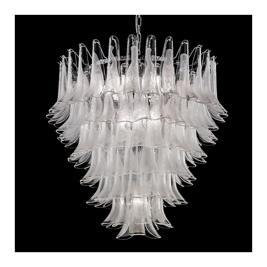 Murano glas Kronleuchter mit transparenten und leichten Blättern. Opalglas mit Chrom oder Gold 24K Struktur.