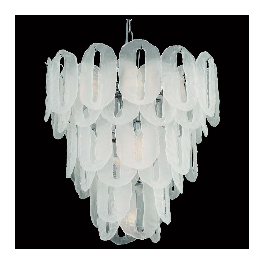 Murano glas Kronleuchter Chiacchiere, wie ein typisch venezianischer Süßer. Glas transparent oder transparent mit weißem Dekor. Chromrahmen.