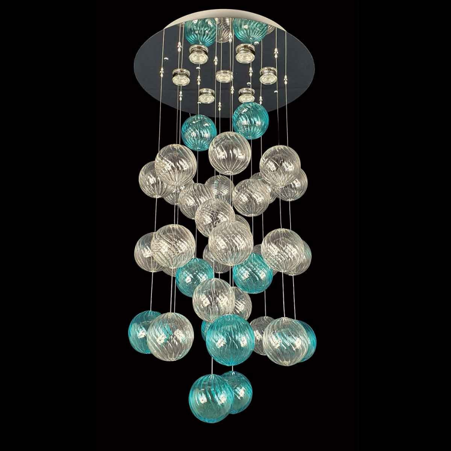 Wie große Tränen fallen von der Decke, die das Licht der kleinen LED-Scheinwerfer reflektieren und filtern, in diesem modernen Kronleuchter aus Muranoglas.