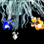 Chandelier with glass owls from Murano, solid and blown, various colors, silver-blue structure.