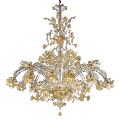 Add a little more light and flair to any room with this spectacularly chandelier made Murano glass. Impressive and rich, it gives a dramatic look to your place. Transparent/gold glass color.