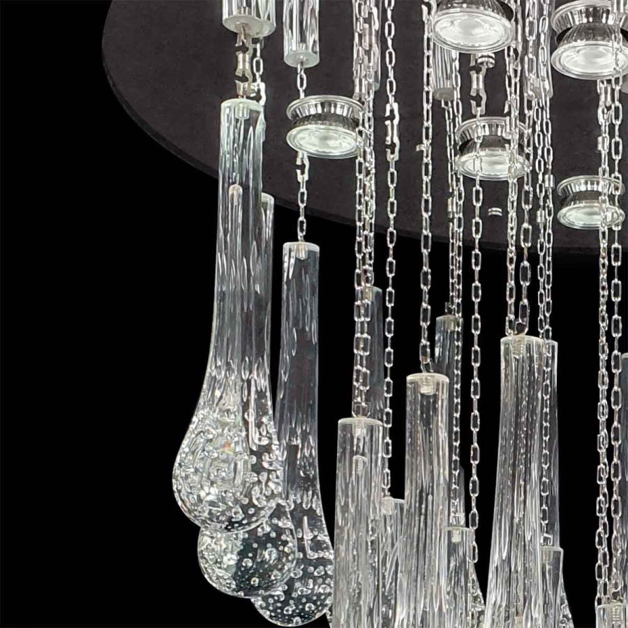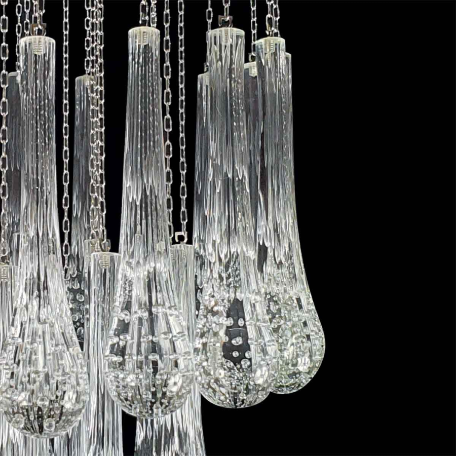 Like big tears fall from the ceiling reflecting and filtering the light of the small LED headlights, in this modern Murano glass chandelier.
