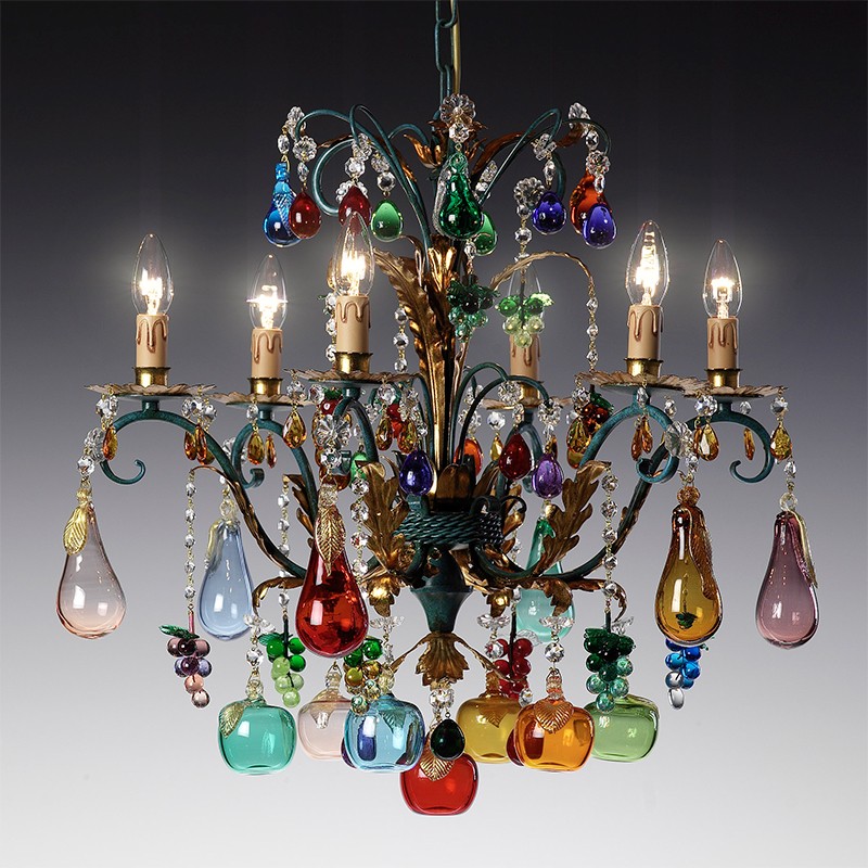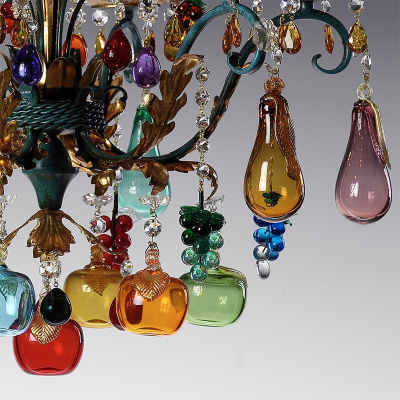 Uvas, peras, manzanas y muchas otras frutas de vidrio soplado en esta hermosa lámpara de araña de Murano