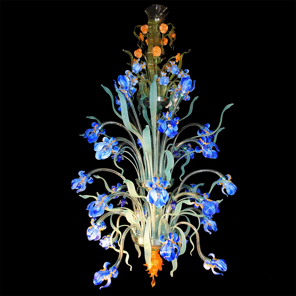 Araña veneciana de cristal de Murano con maravillosa creación de flores de iris y rosas rojas.