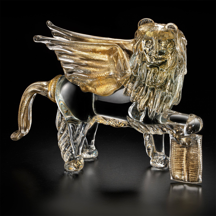 León grande en cristal de Murano transparente oro