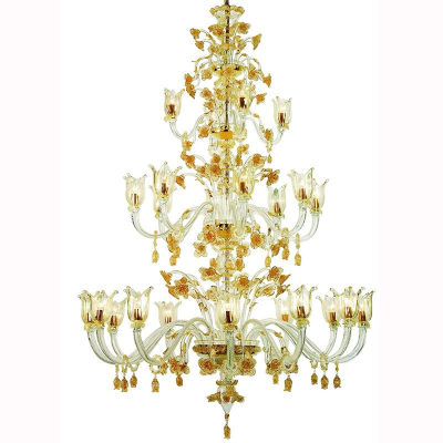 Araña de cristal de Murano de estilo clásico en oro transparente de 24 k. En el centro de la araña se destacan magníficas flores y hojas de oro.