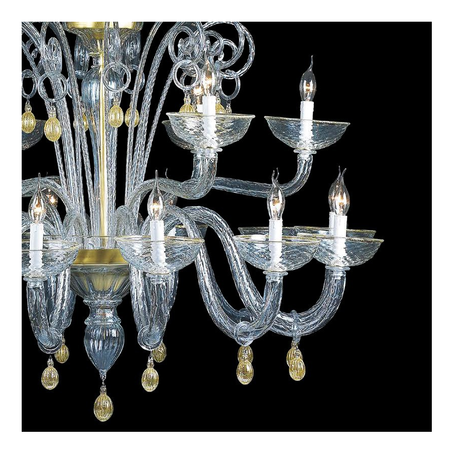 Hermosa lámpara de araña en cristal de Murano dorado. Tiene una forma redonda en el borde de los portalámparas.