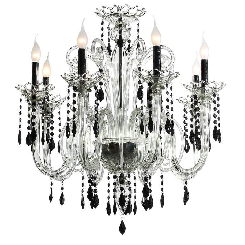 Delicada lámpara de araña en blanco y negro, de formas sinuosas con las copas hacia arriba, como la mayoría de las lámparas de araña de Murano.