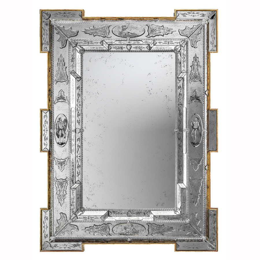 Magnífico espejo veneciano en vidrio grabado envejecido.