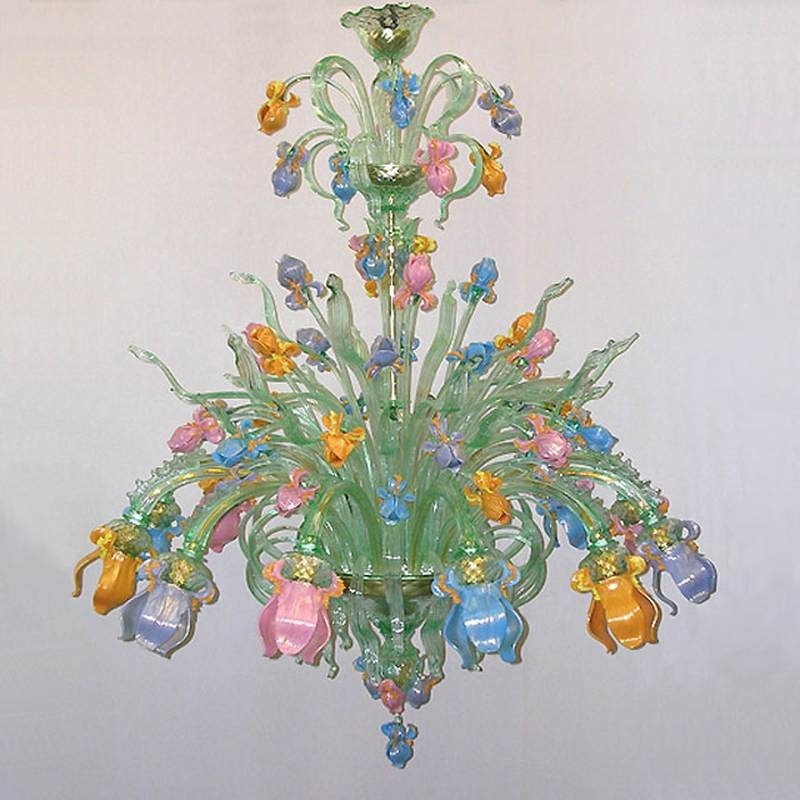 Esta es una clásica lámpara Rezzonico en cristal transparente y flores coloradas.