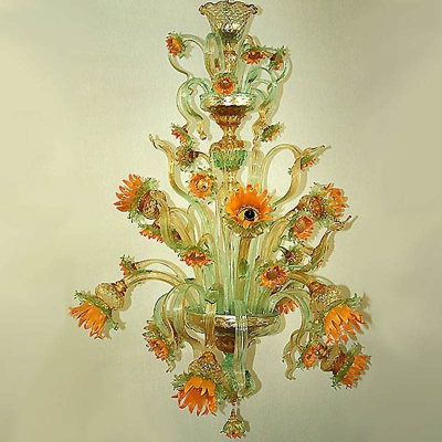Belleza ideal en esta lámpara de Murano. Una forma perfecta en la que todas las lámparas de araña de cristal veneciano debe ser similar. Los colores brillantes y formas suaves con fantástico detalle de las flores.