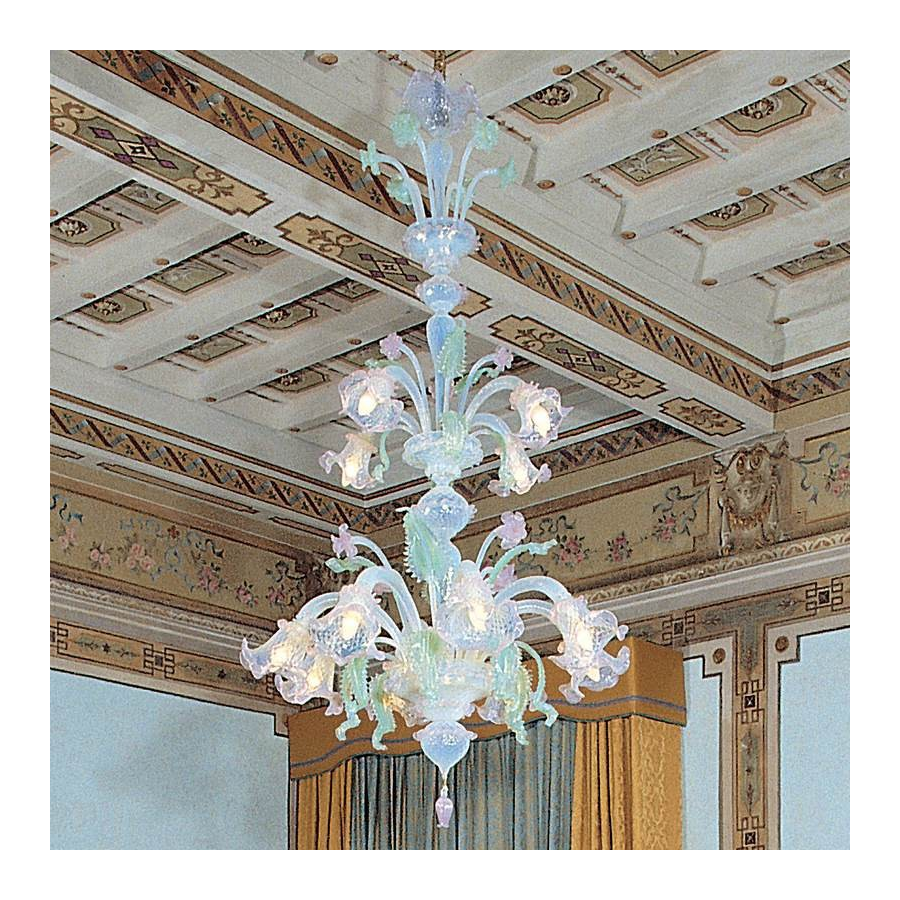 Lámpara Rezzonico en cristal de Murano, la transparencia y la delicadeza de los colores nos hacen soñar la Venecia del antiguo esplendor