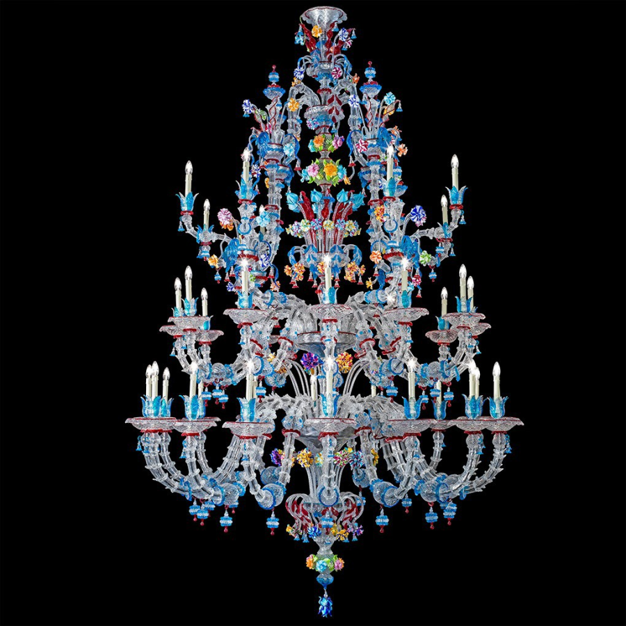 La lámpara Rezzonico de cristal de Murano Aurora presenta una fusión armoniosa de colores vibrantes, creando una sinfonía visual impresionante que captura la esencia del lujo antiguo.