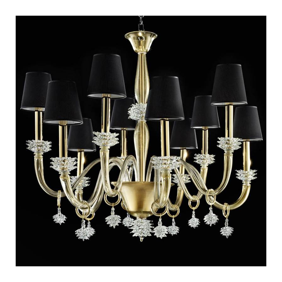 Una tremenda araña de cristal de Murano negro y dorado, elaborada con un estilo exquisito. El diseño principal es sofisticado, totalmente hecho a mano, decorado con colgantes claros