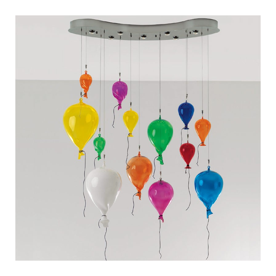 Agradables colgantes en forma de globo en cristal de Murano. Disponible con o sin luz, en los colores: ámbar, rojo, blanco, amatista, magenta, verde, naranja, amarillo, azul claro, azul y Alejandrita.