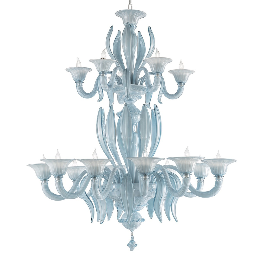 Araña de cristal de Murano de seda y oro escondido, con decoraciones de color azul claro.