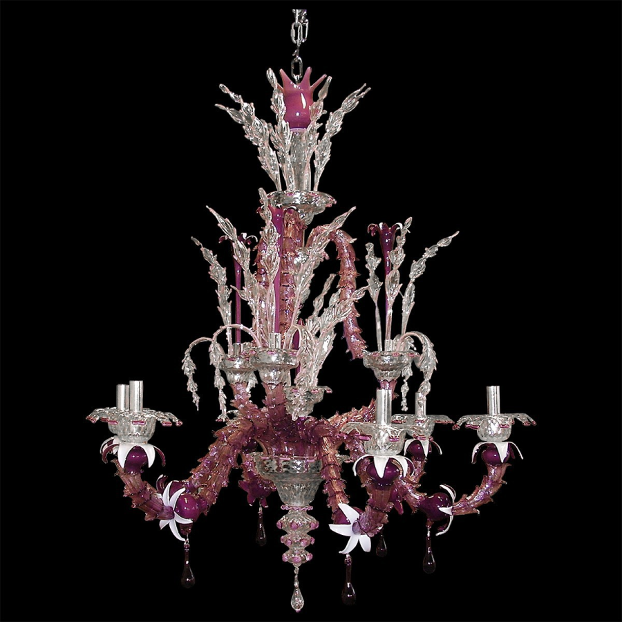 Araña de cristal de Murano 6 luces, tipo Rezzonico en cristal burdeos y transparente. Disponible en colores y dimensiones bajo pedido.