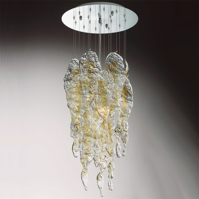 Lámpara de cristal de Murano con hojas que parecen gotas de vidrio esmerilado. Cristal Pulegoso con decoraciones seda. Estructura cromada.
