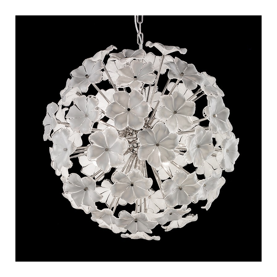 Lámpara de cristal de Murano con hojas que parecen gotas de vidrio esmerilado. Cristal Pulegoso con decoraciones seda. Estructura cromada.