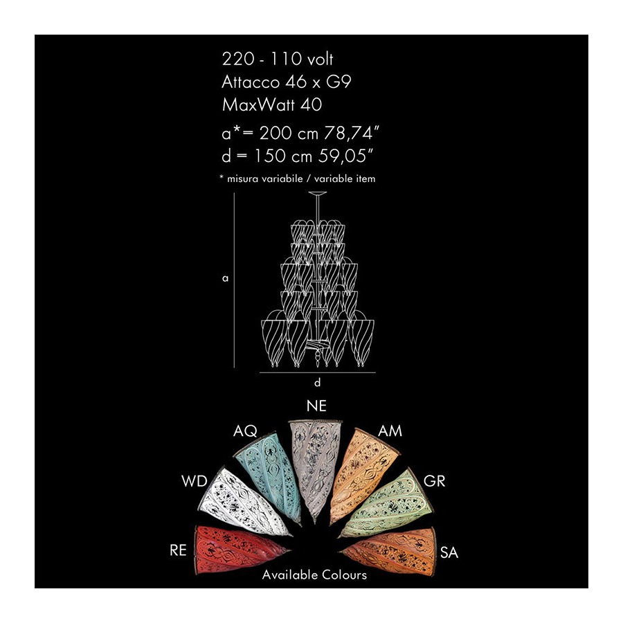 Lustre détaillée et élaborée verre vénitien avec des couleurs fabuleuses et personnalité unique, faite avec authentique verre de Murano de Venise par des artistes talentueux.