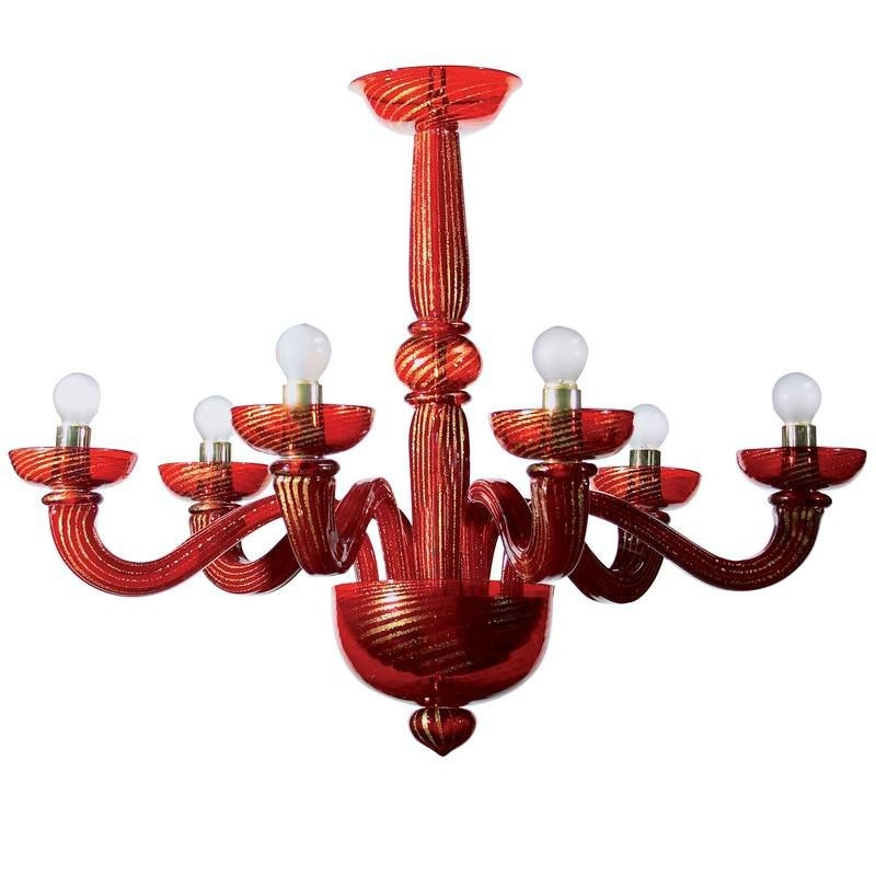 Ce superbe lustre de Murano comporte six lumières et est entièrement fabriqué en verre rouge vif. Le design audacieux du lustre met en valeur des bras finement détaillés et une colonne centrale ornée de textures élaborées en forme de feuille qui rayonnent de sophistication et de flair artistique. Chacun des six bras supporte un luminaire élégant en forme de bougie, qui complète la teinte rouge spectaculaire du verre. La combinaison de la couleur intense et du travail du verre complexe donne lieu à une pièce captivante qui sert à la fois de source de lumière fonctionnelle et de pièce maîtresse époustouflante, incarnant le savoir-faire exceptionnel et l'élégance de l'art du verre de Murano.