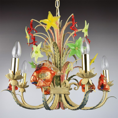 Remarquable lustre en verre vénitien avec ornement floral. La silhouette du lustre est transparent, tandis que les fleurs sont multicolores.