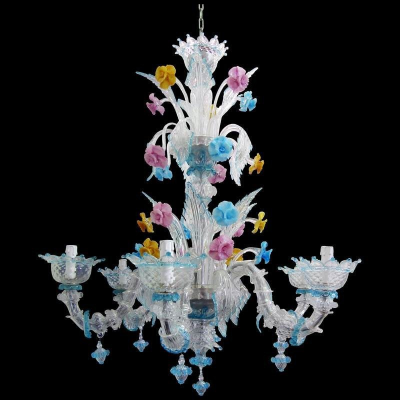 Un lustre vénitien classique en style semi-Rezzonico. Les détails de l'aigue-marine et les fleurs colorées améliorer sa beauté.
