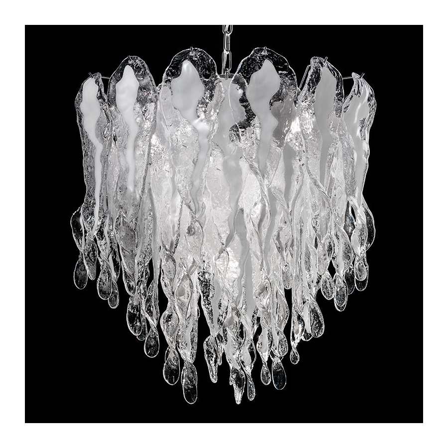Lustre en verre de Murano qui semble sculpté dans la glace. Verre transparent ou opale avec la structure chrome ou or 24K.