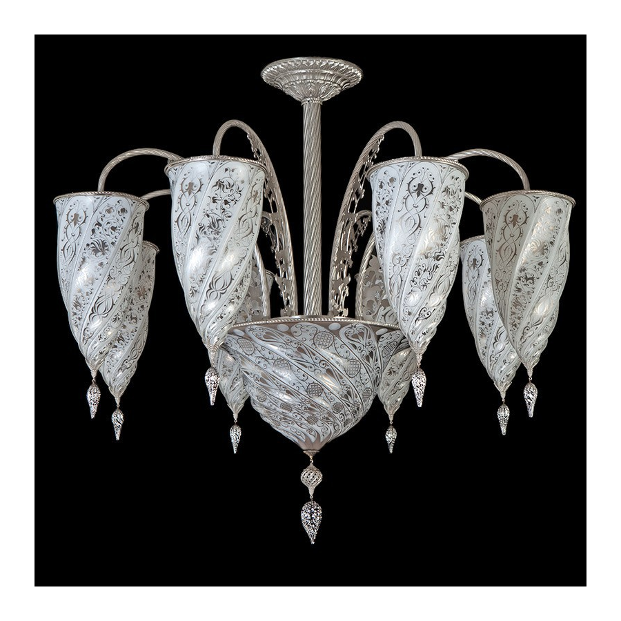 Questo sorprendente e spettacolare lampadario in vetro veneziano si presenta con larghe forme curve con bordi taglienti che gli conferiscono un aspetto molto bello e delicata. E' una aggiunta molto importante alla vostra casa ed è progettato per abbellire il vostro spazio interno e renderlo più attraente. Questo perfetto lampadario veneziano è autentico vetro di Murano, Venezia, ed è stato fabbricato con un metodo altamente innovativo.
