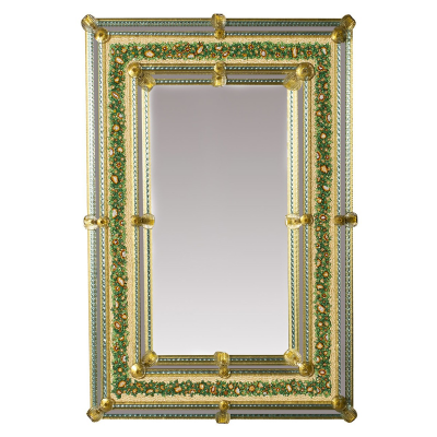Caigo - Specchio veneziano in vetro di Murano con fiori e foglie verdi.