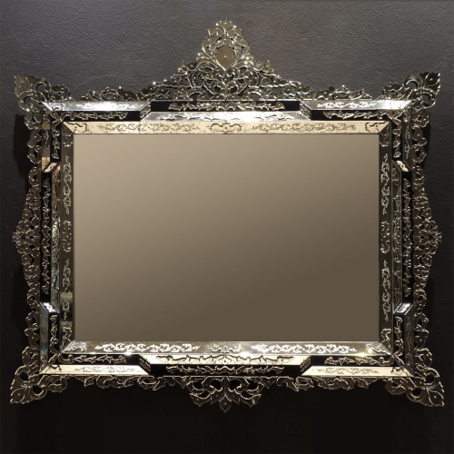 Specchio veneziano di lusso in vetro di Murano, molato e inciso.