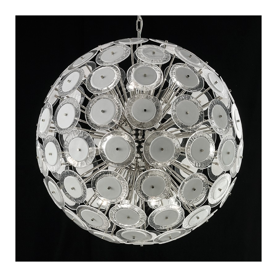 Lampadario in vetro di Murano con dischi di vetro a forma di globo. Vetro disponibile nero o bianco. Telaio cromato.