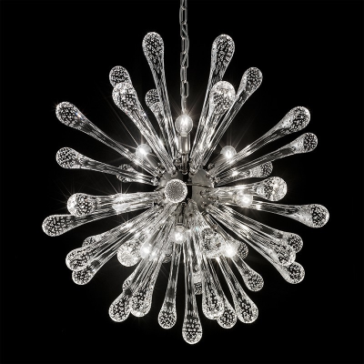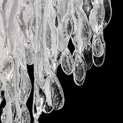 Come grosse lacrime scendono dal soffitto riflettendo e filtrando la luce dei piccoli fari LED, in questo moderno lampadario in vetro di Murano.