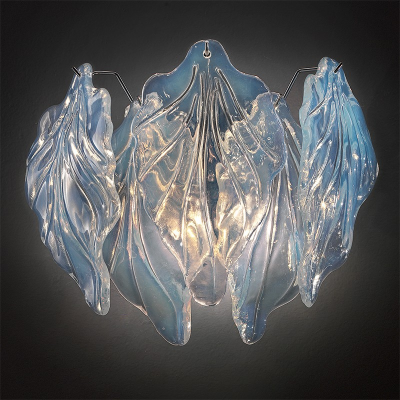 Lampadario in vetro di Murano con foglie leggere e trasparenti. Vetro opalino con struttura cromata o dorata 24K.