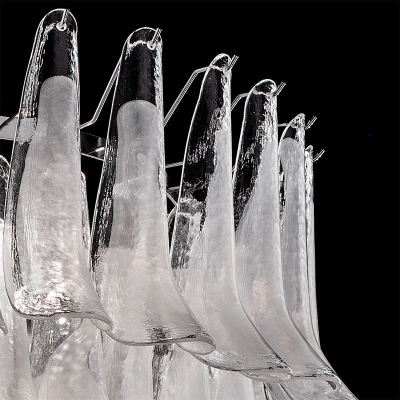 Lampadario in vetro di Murano Chiacchiere, come il tipico dolce veneziano. Vetro disponibile trasparente o trasparente con decori bianchi. Struttura Cromo.
